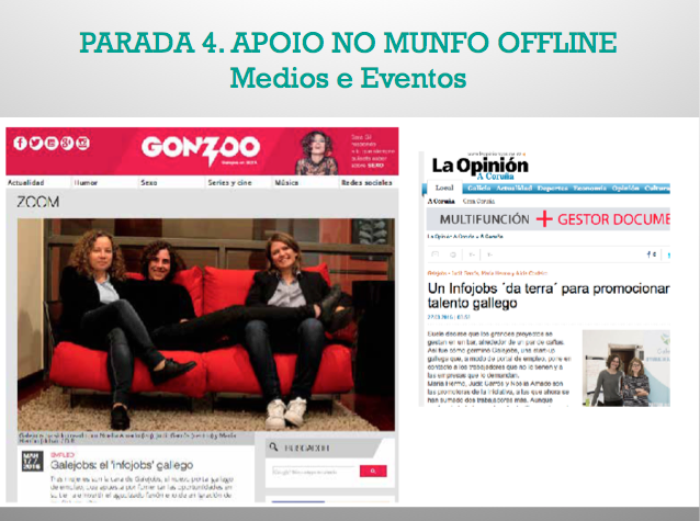 A seguinte parada da nosa viaxe foi nos eventos offline e medios de comunicación: tratamos de estar disponibles para quen nos reclame, tanto se é o xornal máis coñecido coma a radio dunha pequena aldea.