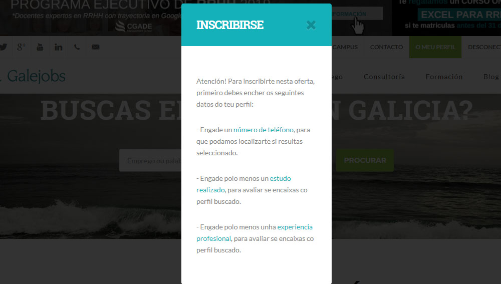 É certo que cun só dato, xa podes inscribirte nunha oferta de emprego. Mais tamén é certo que o primeiro que unha empresa ve en Galejobs dun candidato /a que solicita a súa oferta son esas dúas sección e non o cv adxunto. E, coma sabes, a primeira impresión é moi importante… Dito isto, ti decides!