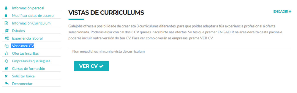 Nesta sección podes crear ata 3 versións do teu curriculum. Só tes que premer Engadir, ponerlle un nome á versión – só o verás ti; podes chamarlle por exemplo ‘Cv administración’ e facer outra versión co nome ‘Cv hostalaría’- e decidir que datos queres amosar. Irás vendo tódolos datos que escribiches e poderás escoller se amosalos ou non.